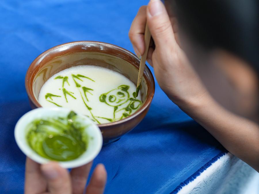 21日、パンダ文化クリエーティブマーケットでパンダのラテアートを描く茶芸師。(成都=新華社記者/王曦)