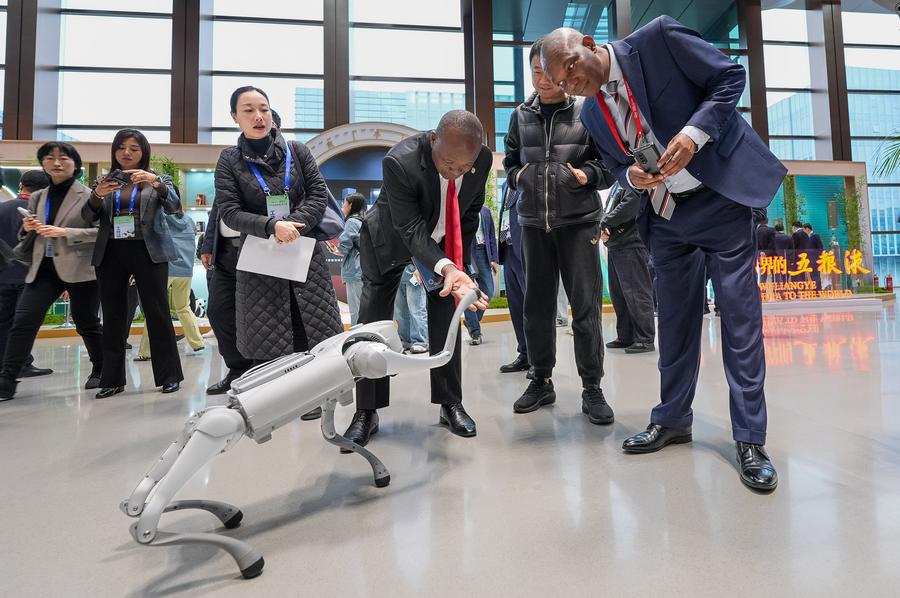 21日、グローバルパンダパートナー大会でロボットと触れ合う来賓。(成都=新華社記者/江宏景)