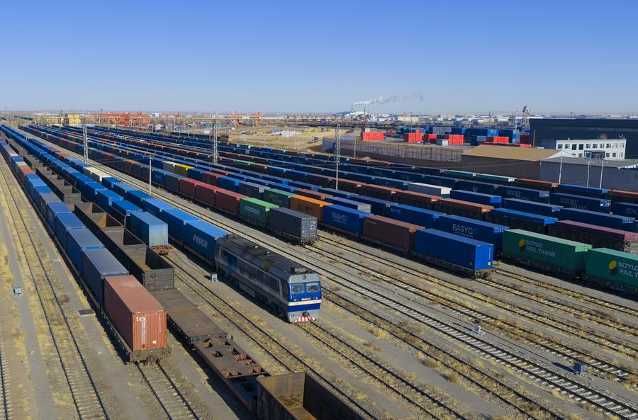 エレンホト鉄道口岸の標準軌道場に停車する中欧班列。(エレンホト=新華社配信)