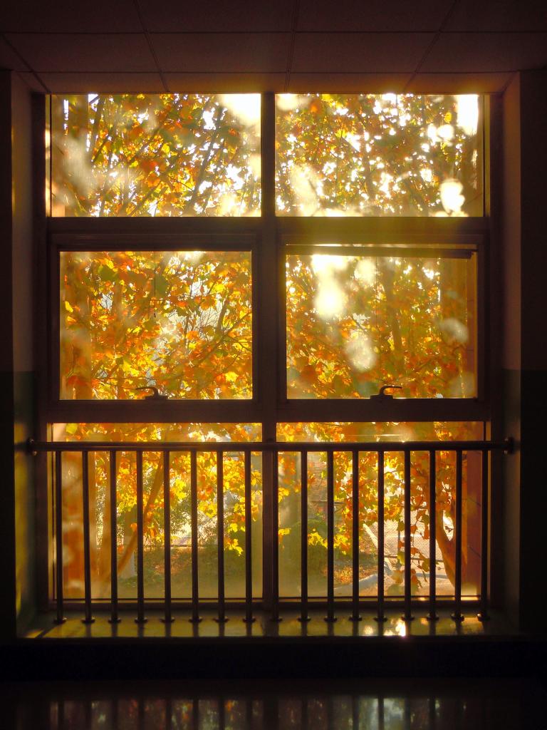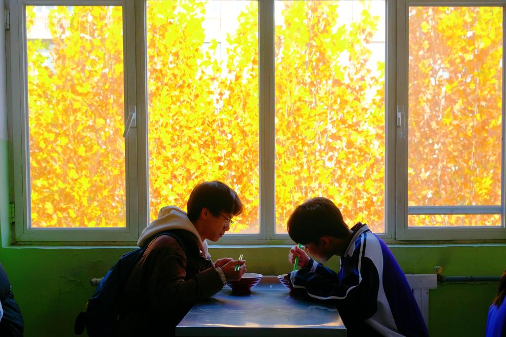 木漏れ日が差し込む楊村第一中学の窓辺。(11月9日撮影、天津=新華社配信/劉浩然)