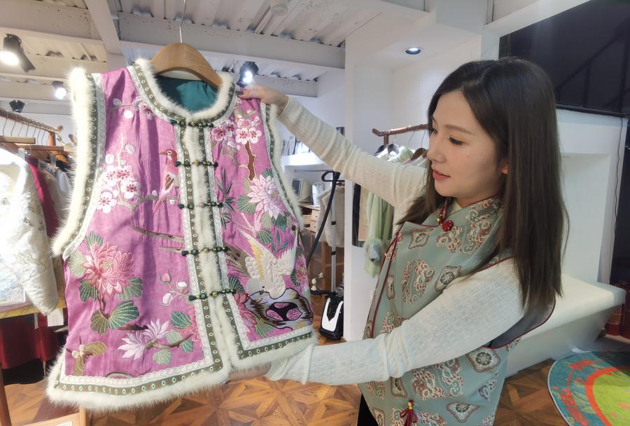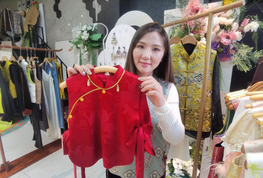 「新中式」の服飾品を見せる服飾店「見己中式美学」の創業者、張夢婷(ちょう・むてい)さん。(済南=新華社記者/王凱)