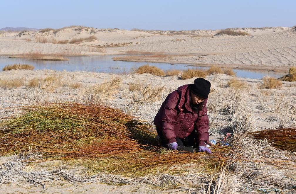 黄柳の苗を切り分けるオンニュド旗阿什罕蘇木(ソム)の住民。(11月14日撮影、赤峰=新華社記者/賈立君)