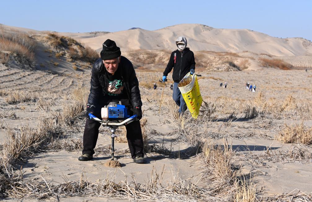 わらなどを地面に格子状に埋め込んで砂の移動を防ぐ「草方格」の中に黄柳の苗を植えるオンニュド旗阿什罕蘇木(ソム)の牧畜民。(11月14日撮影、赤峰=新華社記者/賈立君)