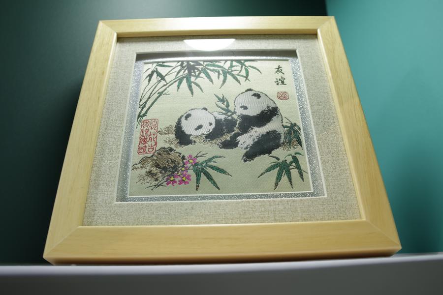 21日、成都発祥の伝統絹織物「蜀錦」を使った刺しゅう製品。(成都=新華社記者/藍建中)
