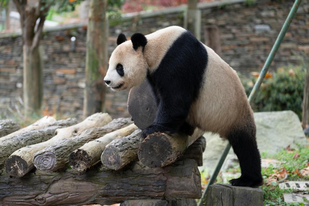 【新華社成都11月26日】中国四川省のジャイアントパンダ保護研究センター臥竜神樹坪基地で、台の上に登ろうとする雄のパンダ、リーリー(力力、中国名「比力」)が撮影された。