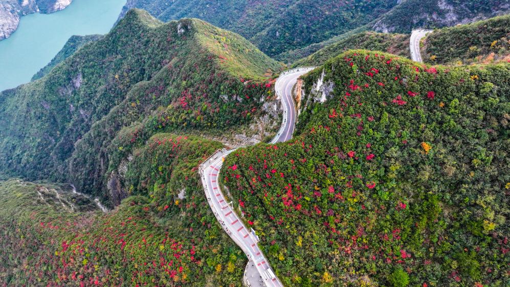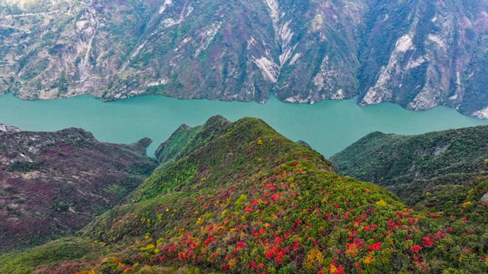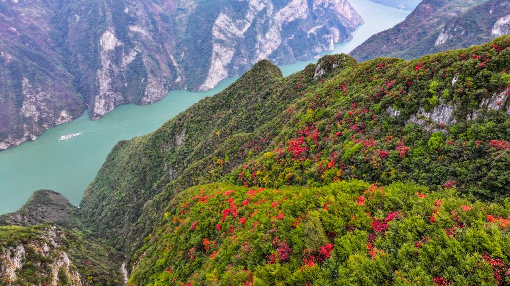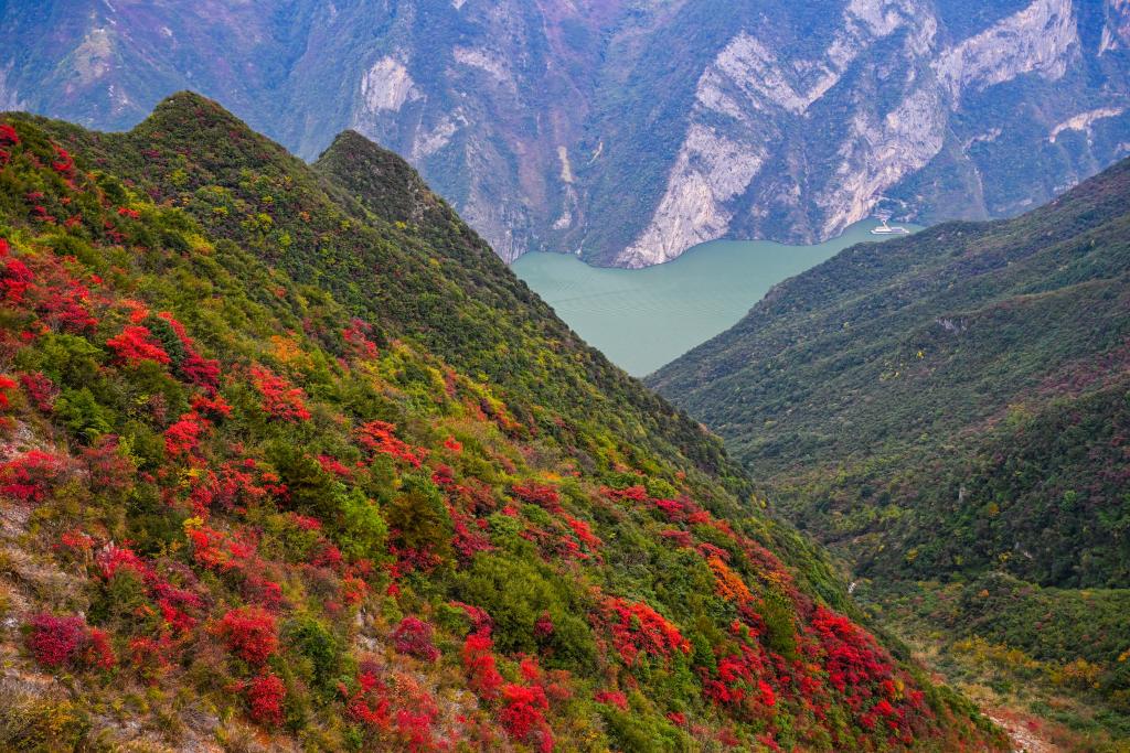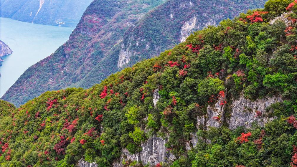 【新華社重慶11月27日】中国重慶市巫山(ふざん)県の長江巫峡一帯は、冬になると紅葉で赤く染まる。県内には約120万ムー(8万ヘクタール)にわたって200種類近くの紅葉樹があり、11月から翌年1月まで見頃が続く。