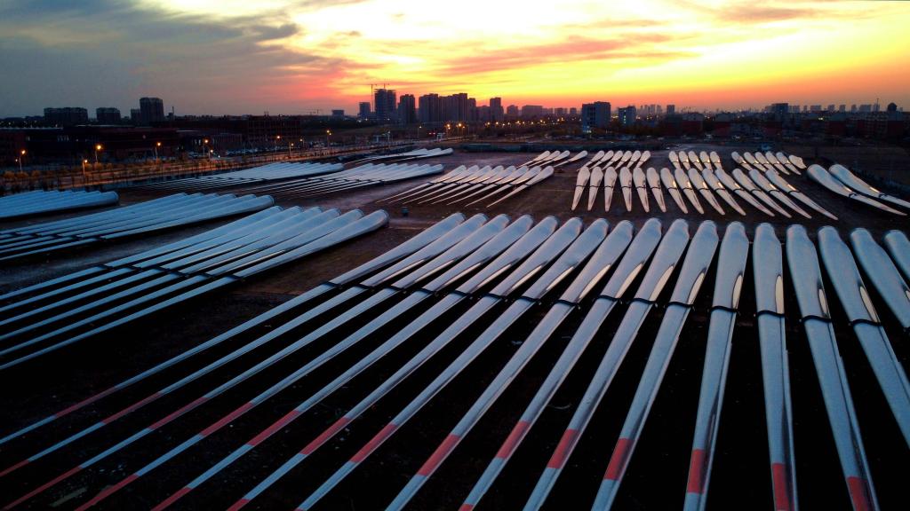 19日、浜州市恵民県の風力発電設備製造産業パークにあるブレード保管場。(ドローンから、済南=新華社記者/郭緒雷)
