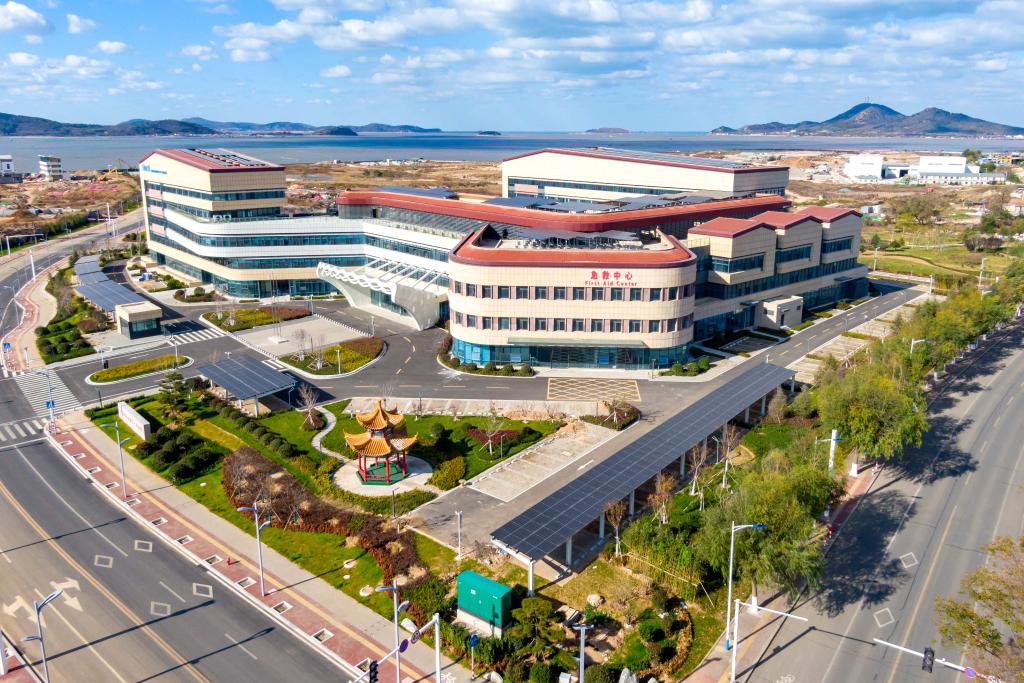 18日、煙台市長島海洋生態文明総合試験区にある人民医院。太陽光パネルが屋上に敷きつめられている。(ドローンから、済南=新華社配信/張維康)