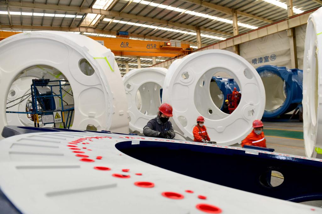 19日、浜州市恵民県にある風力発電設備製造産業パークの塗装工場で、風車のハブを塗装する作業員。(済南=新華社記者/郭緒雷)