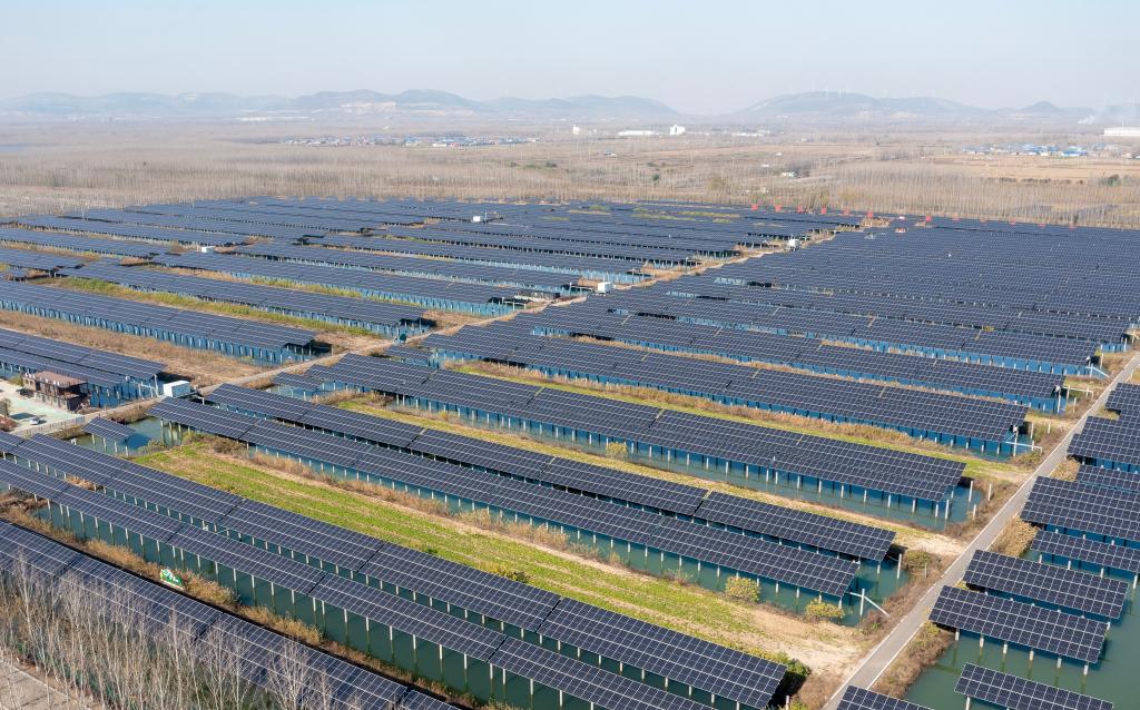 18日、滕州市浜湖鎮の石炭採掘による陥没地区で進められている、養殖業と太陽光補完を一体化したプロジェクト。(ドローンから、済南=新華社配信/宋海存)