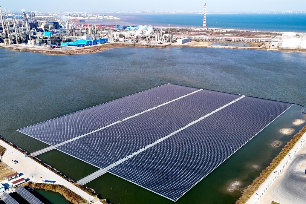 18日、中国石化青島煉化の浮体式太陽光発電プロジェクト。(済南=新華社配信/張進剛)
