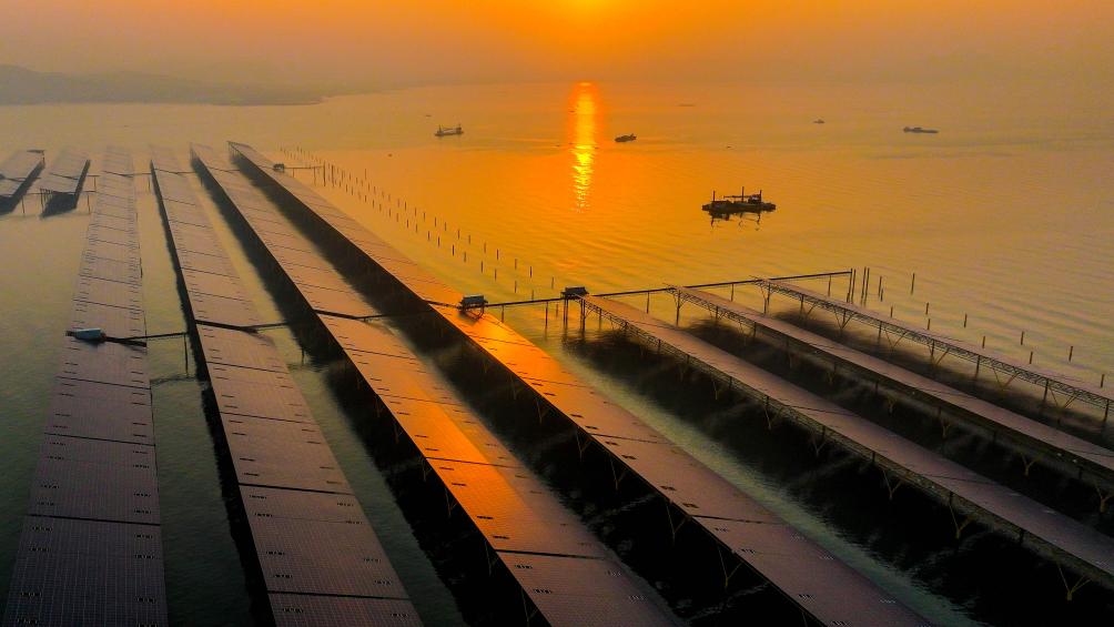 16日、青島市鰲山湾海域の海上固定式太陽光発電プロジェクト。(ドローンから、済南=新華社配信/梁孝鵬)