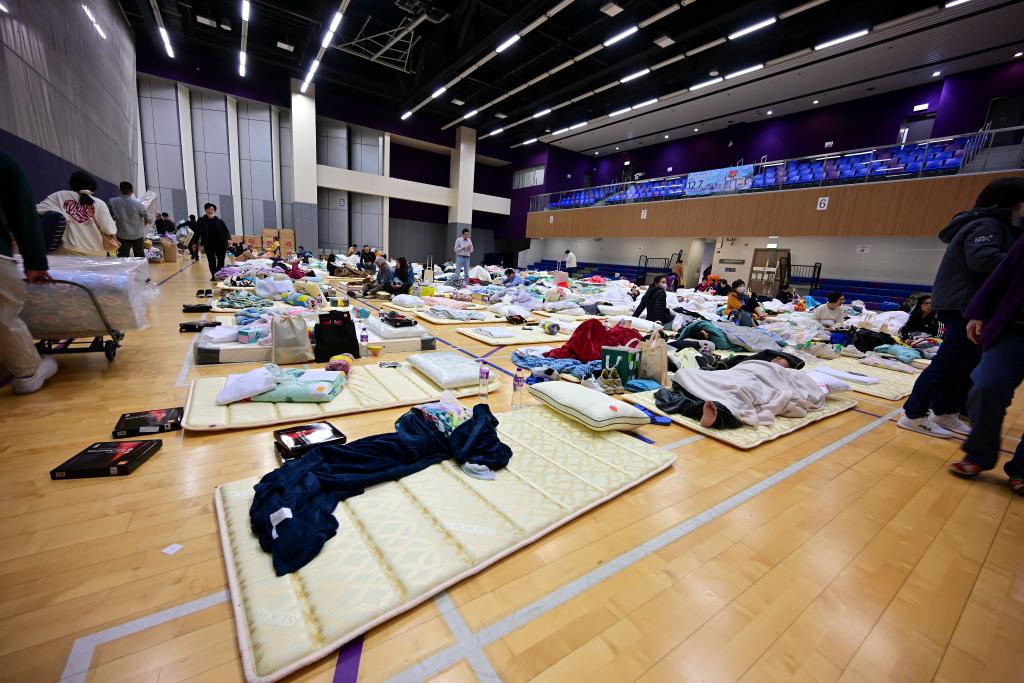 27日、火災現場となった高層住宅団地「宏福苑」の近くに設置された臨時避難所。(香港=新華社記者/朱煒)