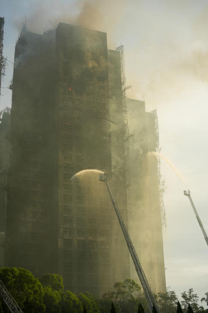 27日、消火活動が続く高層住宅団地「宏福苑」。(香港=新華社記者/朱煒)