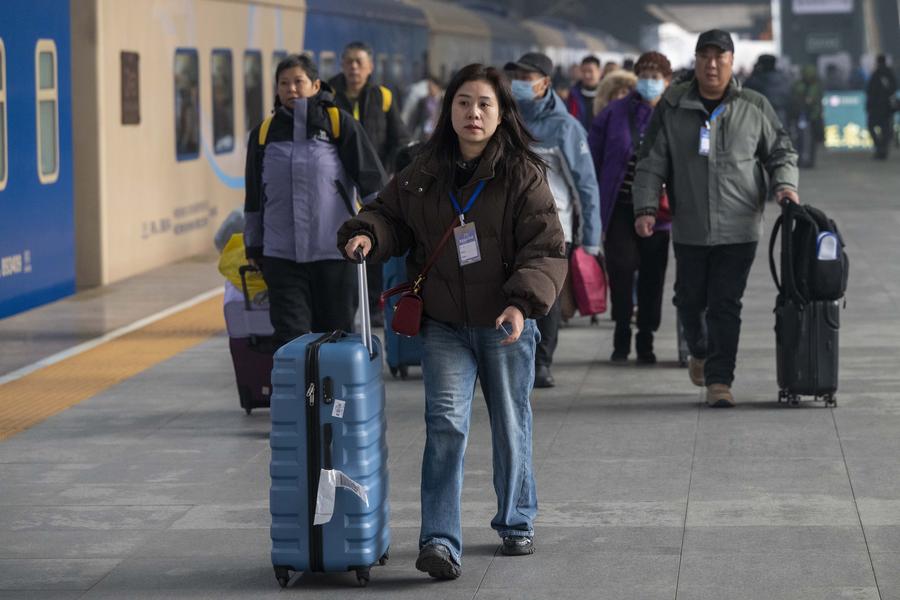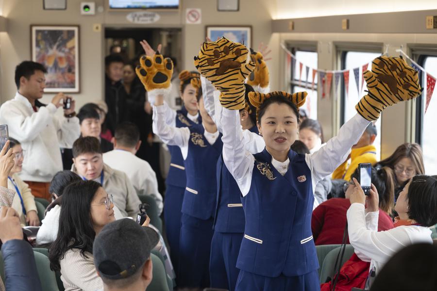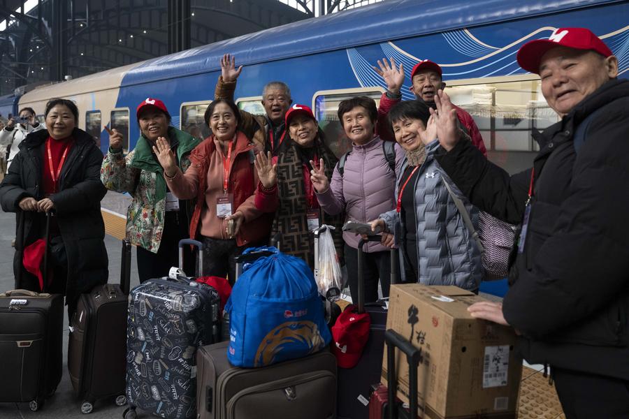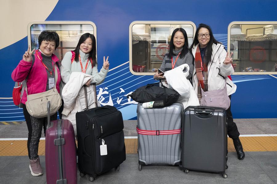 【新華社ハルビン11月28日】中国黒竜江省ハルビン市のハルビン駅で26日、長江・珠江両デルタ地域から集まった観光客約300人がY783号観光列車「悠享竜江・銀旅号」に乗り込み、6日間の旅に出発した。
