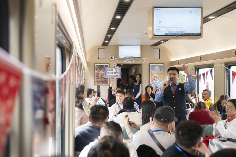 26日、Y783「悠享竜江・銀旅号」の車内でパフォーマンスを披露する乗務員。(ハルビン=新華社記者/張濤)