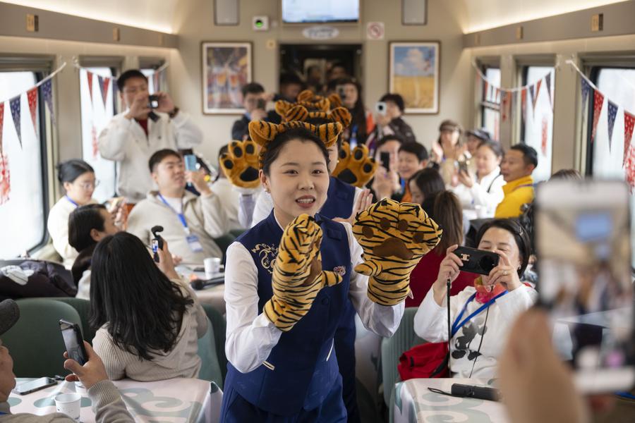 中国鉄路ハルビン局集団がこの冬初めて運行した氷雪観光列車で「スローな旅、深い体験」をコンセプトに、東北地域の文化と氷雪の特色を取り入れている。