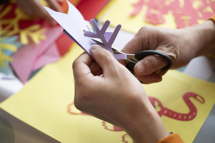 26日、Y783「悠享竜江・銀旅号」の車内で無形文化遺産の剪紙(せんし=切り絵細工)を体験する観光客。(ハルビン=新華社記者/張濤)