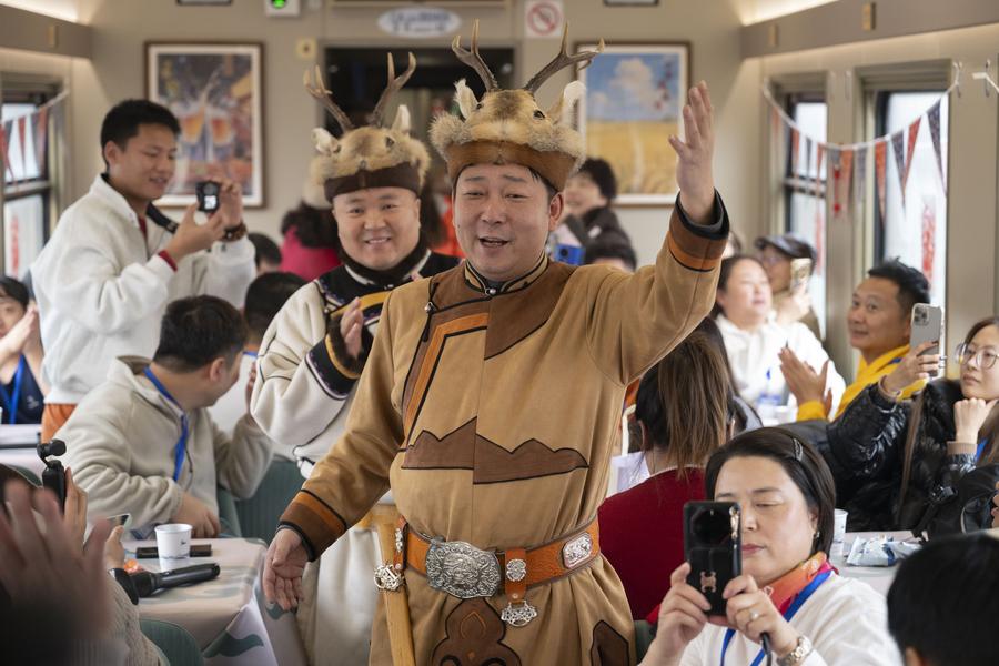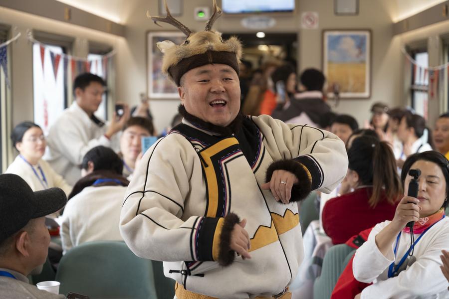 26日、Y783「悠享竜江・銀旅号」の車内でパフォーマンスを披露するオロチョン族の出演者。(ハルビン=新華社記者/張濤)