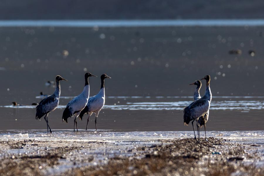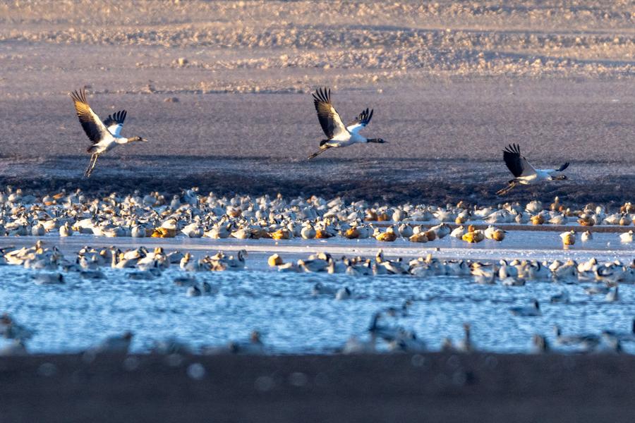 【新華社ラサ11月29日】中国西蔵自治区ラサ市林周(ルンドゥプ)県は冬を迎え、多くの渡り鳥が越冬のため飛来している。オグロヅルやインドガン、アカツクシガモなどが、川べりや湖で餌を探し、羽を休めている。