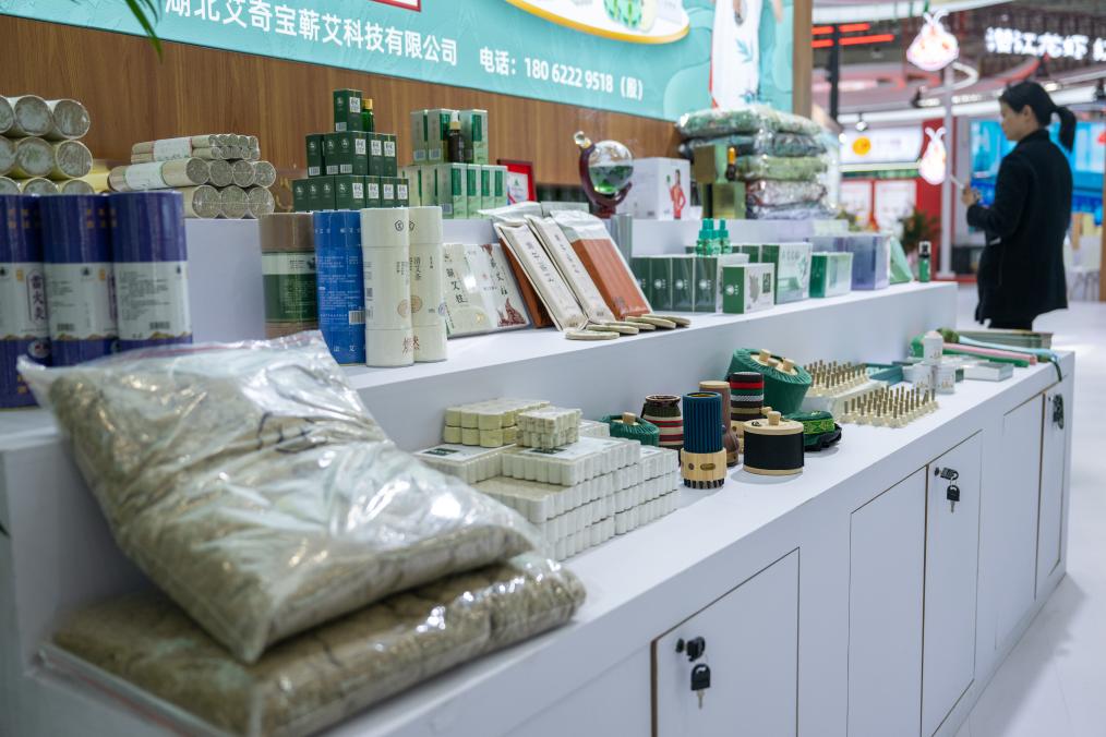 29日、農業博覧会で展示されているヨモギ関連製品。(武漢=新華社記者/杜子璇)