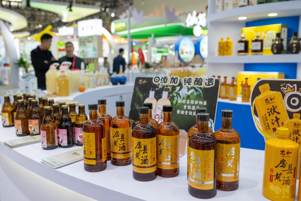 29日、農業博覧会で展示されている湖北省十堰市房県産の黄酒。(武漢=新華社記者/杜子璇)
