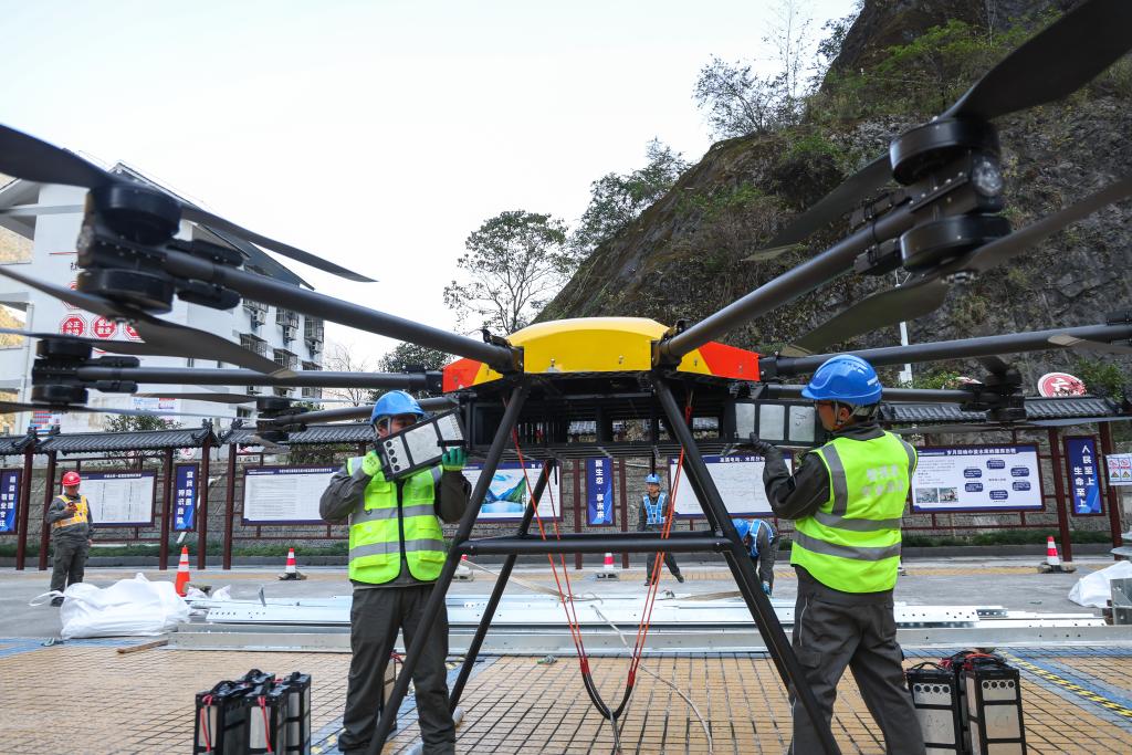 27日、重慶市巫渓県中梁郷の35キロボルト西土線改修工事現場で、高積載ドローンを操作する作業員。(重慶=新華社記者/黄偉)