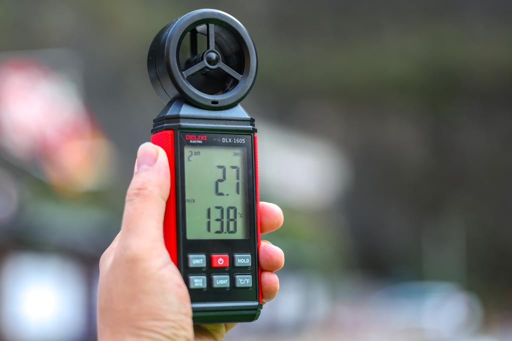 27日、重慶市巫渓県中梁郷の35キロボルト西土線改修工事現場で、作業員が手にした風速計。(重慶=新華社記者/黄偉)