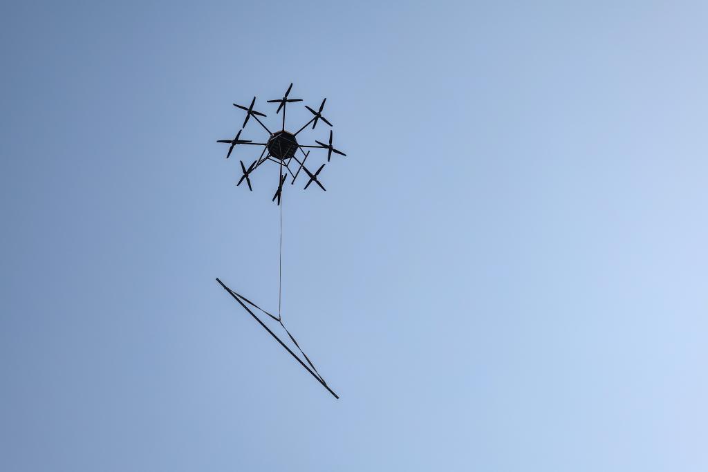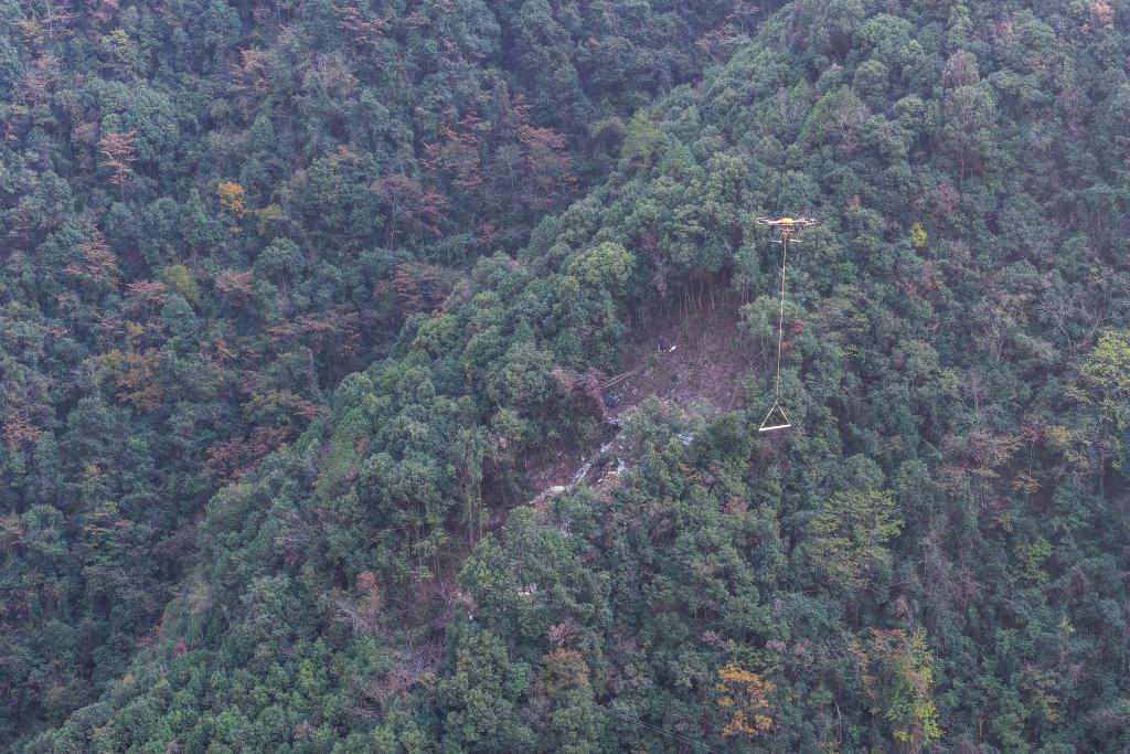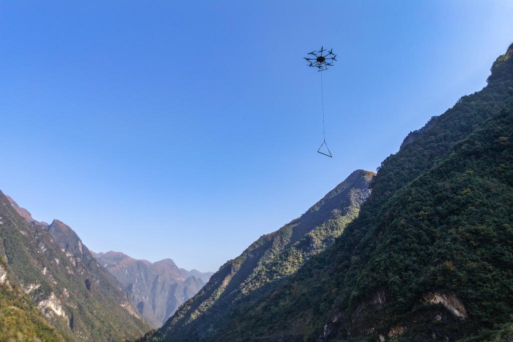 【新華社重慶11月30日】中国重慶市巫渓(ふけい)県中梁郷の35キロボルト西土線改修工事現場で27日、ドローンが険しい山岳地帯を行き来し、鉄塔の建設資材を運んだ。送電大手、国家電網傘下の国網重慶市電力が高積載ドローンを活用し、鉄塔の資材を運んだのは今回が初めて。