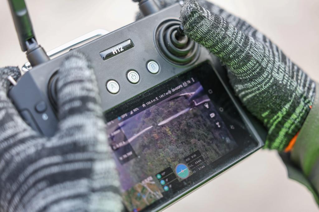 27日、重慶市巫渓県中梁郷の35キロボルト西土線改修工事現場で、作業員が手にした高積載ドローンのコントローラー。(重慶=新華社記者/黄偉)