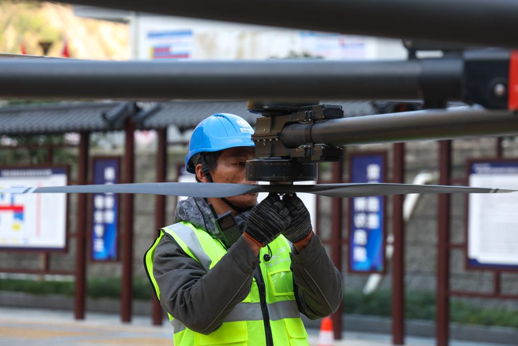 27日、重慶市巫渓県中梁郷の35キロボルト西土線改修工事現場で、離陸前のドローンを検査する作業員。(重慶=新華社記者/黄偉)