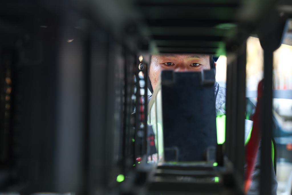 27日、重慶市巫渓県中梁郷の35キロボルト西土線改修工事現場で、ドローンのバッテリーを交換する作業員。(重慶=新華社記者/黄偉)