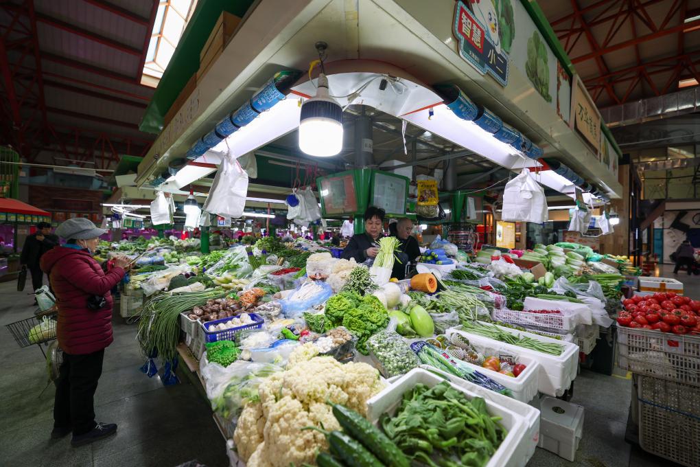 11月25日、天津市河西区の三水道市場で撮影した八百屋。(天津=新華社記者/孫凡越)
