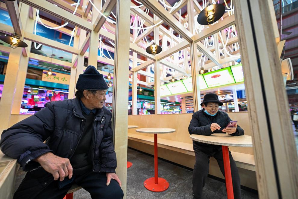 11月25日、天津市河西区の三水道市場の休憩エリアでくつろぐ市民。(天津=新華社記者/趙子碩)