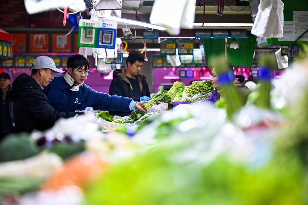 11月25日、天津市河西区の三水道市場で野菜を選ぶ市民。(天津=新華社記者/趙子碩)