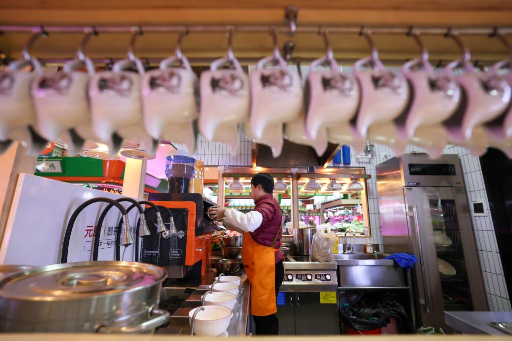 11月25日、天津市河西区の三水道市場で、食材を準備する麺専門店の経営者。(天津=新華社記者/孫凡越)