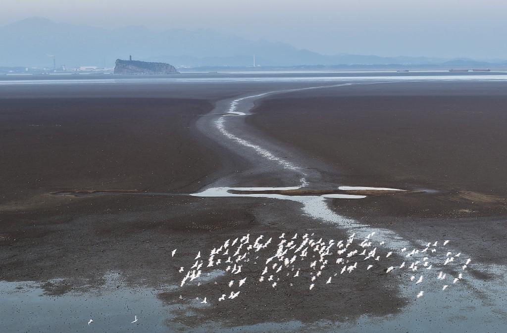 鄱陽湖の鞋山水域(九江市湖口県)で羽を休めるコウノトリ。(11月27日、ドローンから、九江=新華社記者/万象)
