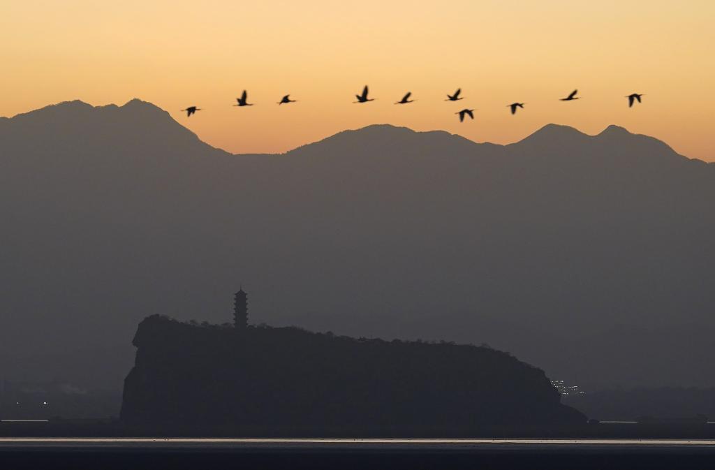 鄱陽湖の鞋山水域(九江市湖口県)で飛ぶ渡り鳥。(11月26日撮影、九江=新華社記者/万象)