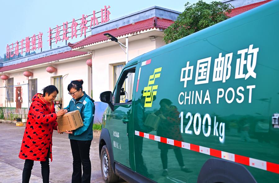 1日、四川省眉山市仁寿県珠嘉鎮で、荷物を届ける配達員。(眉山=新華社配信/潘帥)
