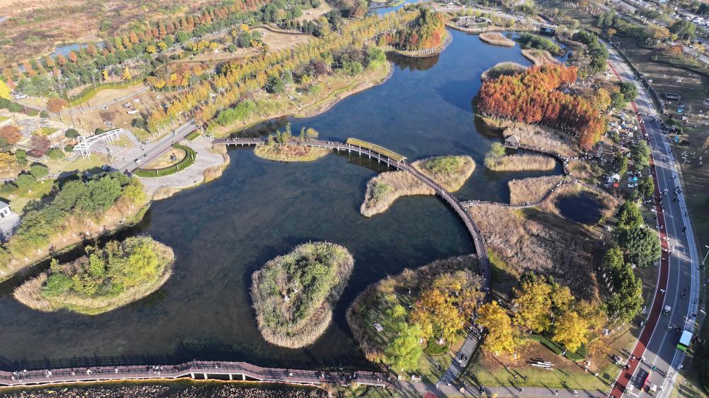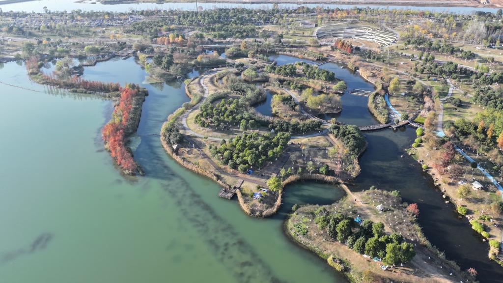 11月30日、空から見た松雅湖国家湿地公園。(ドローンから、長沙=新華社記者/陳振海)