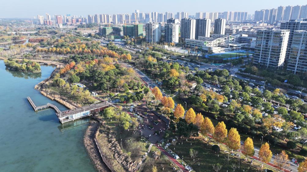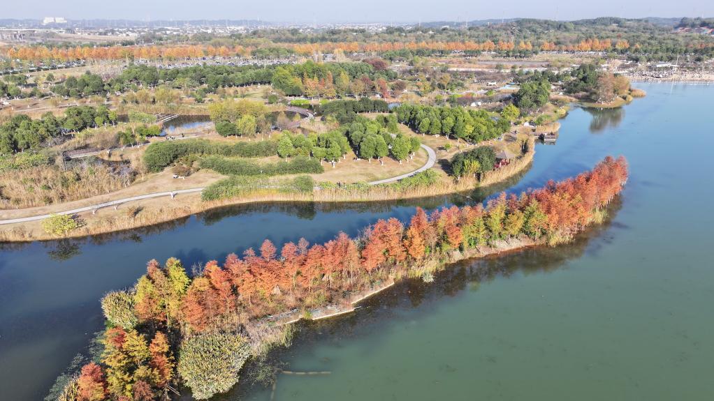 【新華社長沙12月1日】中国湖南省長沙市の松雅湖国家湿地公園でメタセコイアの葉が赤みを帯び始めた。色鮮やかな風景を目当てに多くの人が訪れている。