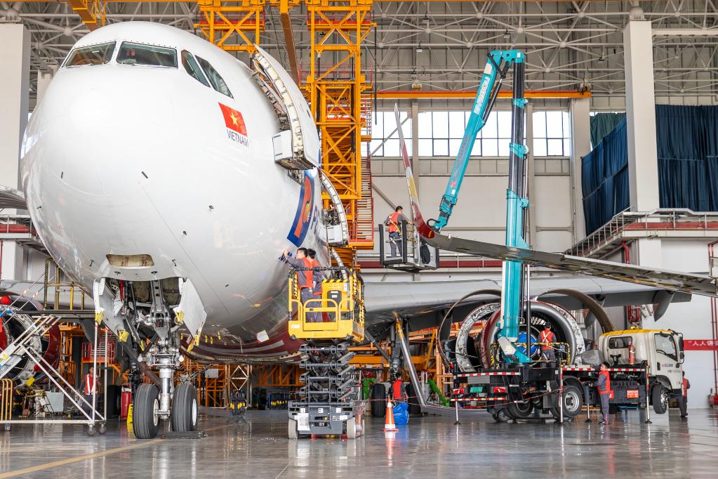 11月21日、海口市の航空機整備産業拠点で整備を受ける航空機。(海口=新華社記者/張麗蕓)