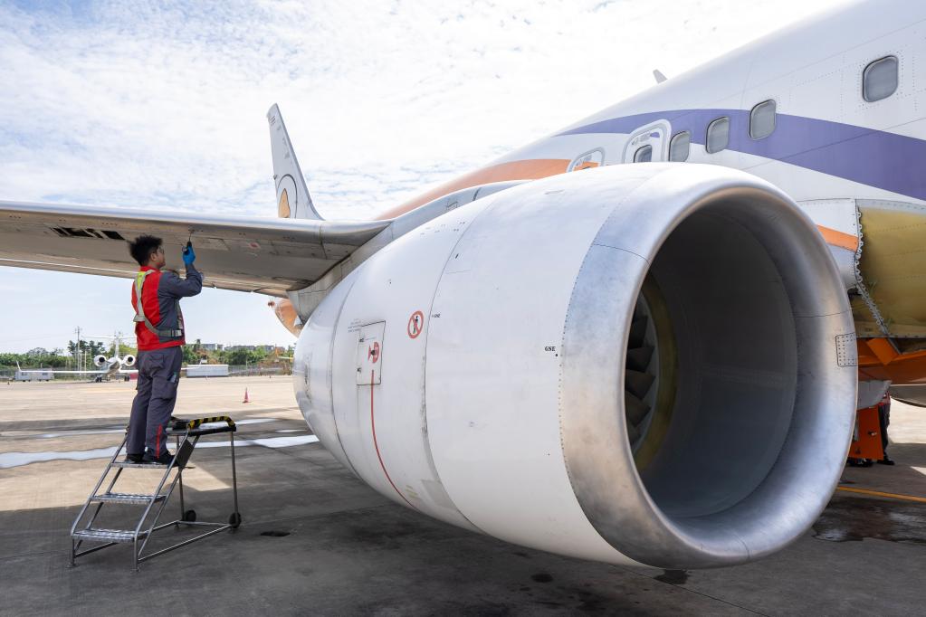 11月21日、航空機の点検整備を行う海航航空技術の傘下、大新華飛機維修サービスの職員。(海口=新華社記者/張麗蕓)