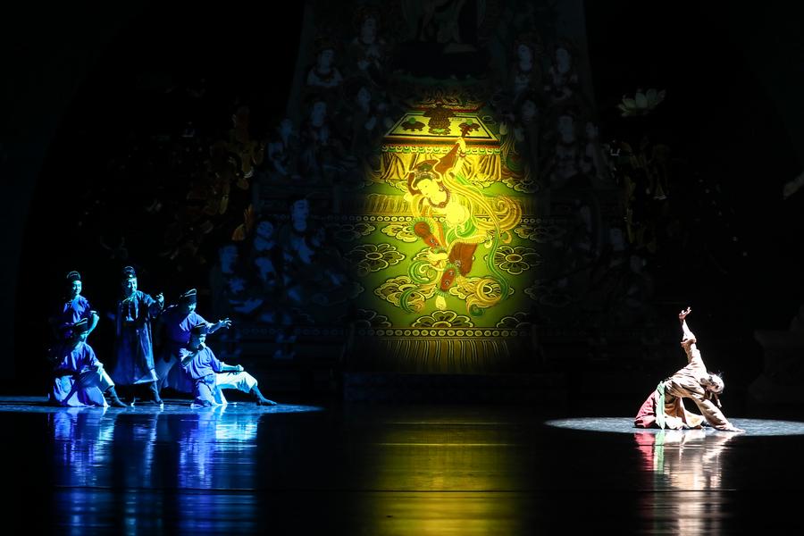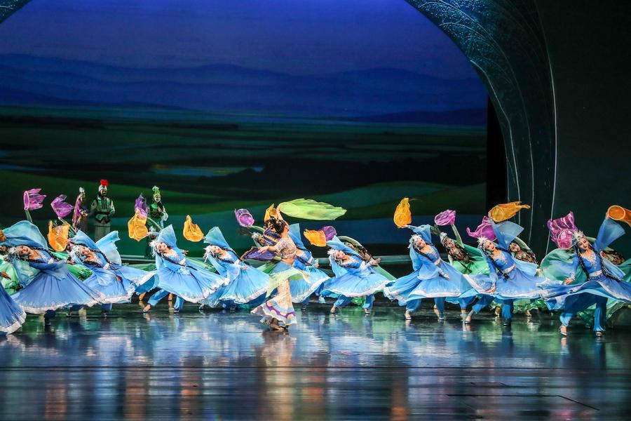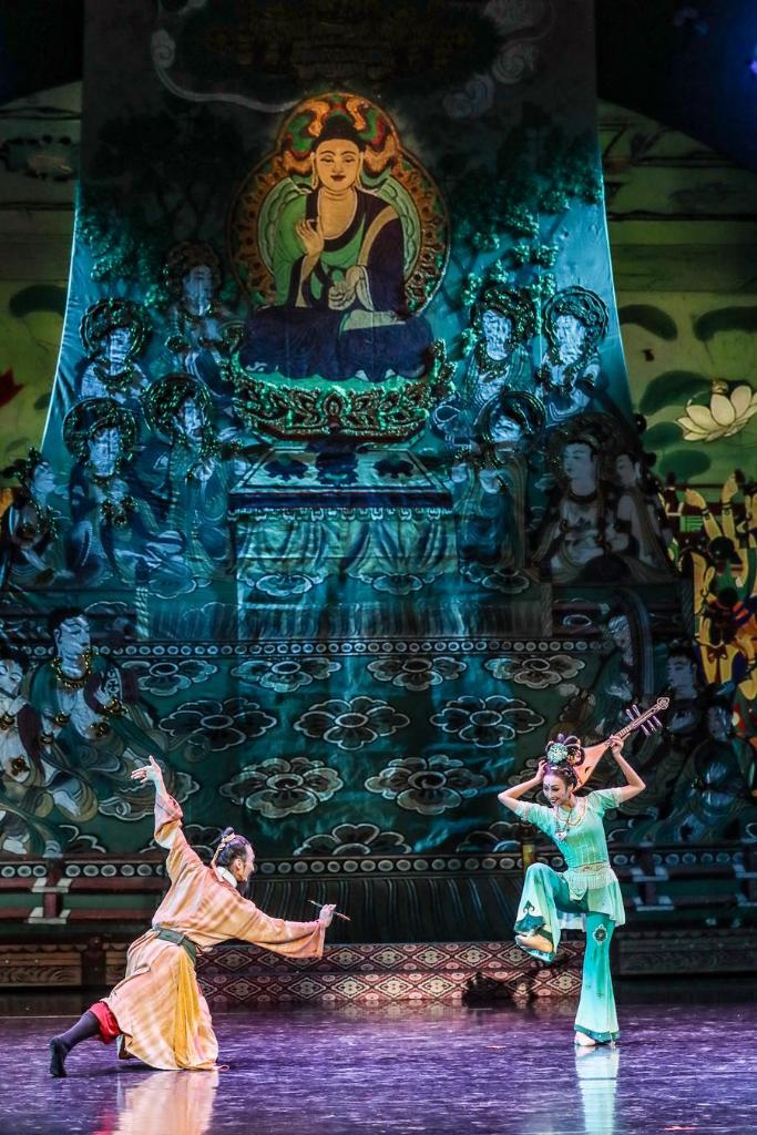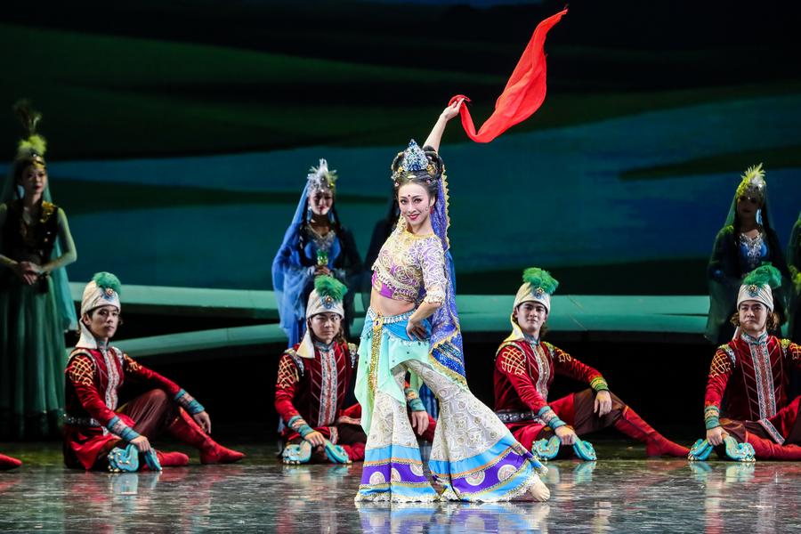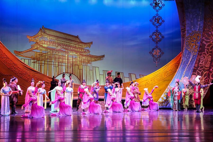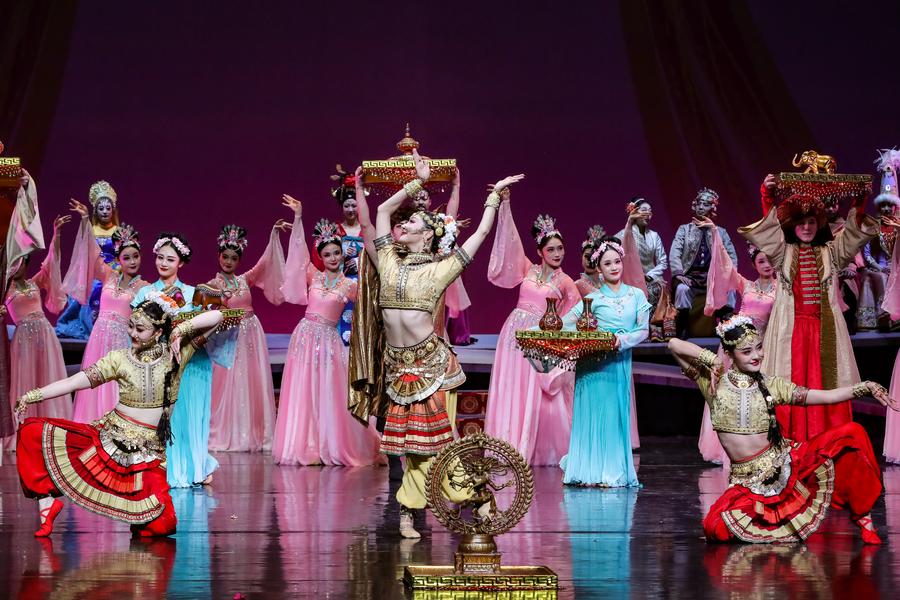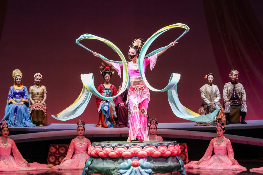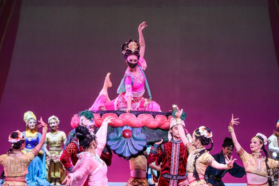 11月28日、甘粛大劇院で舞踊劇「絲路花雨」を披露する出演者。(蘭州=新華社記者/郎兵兵)