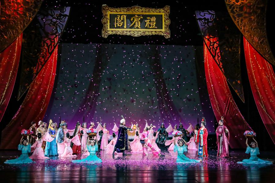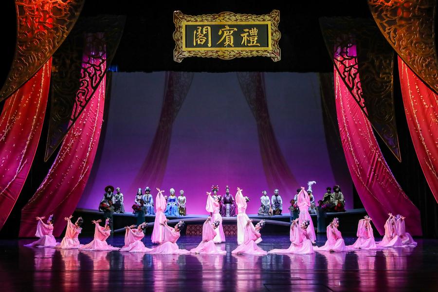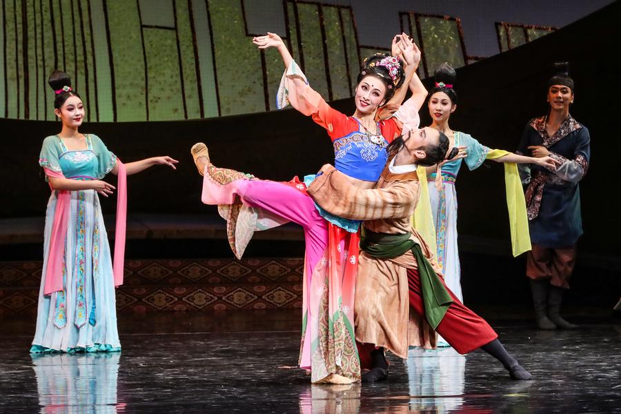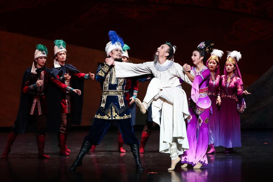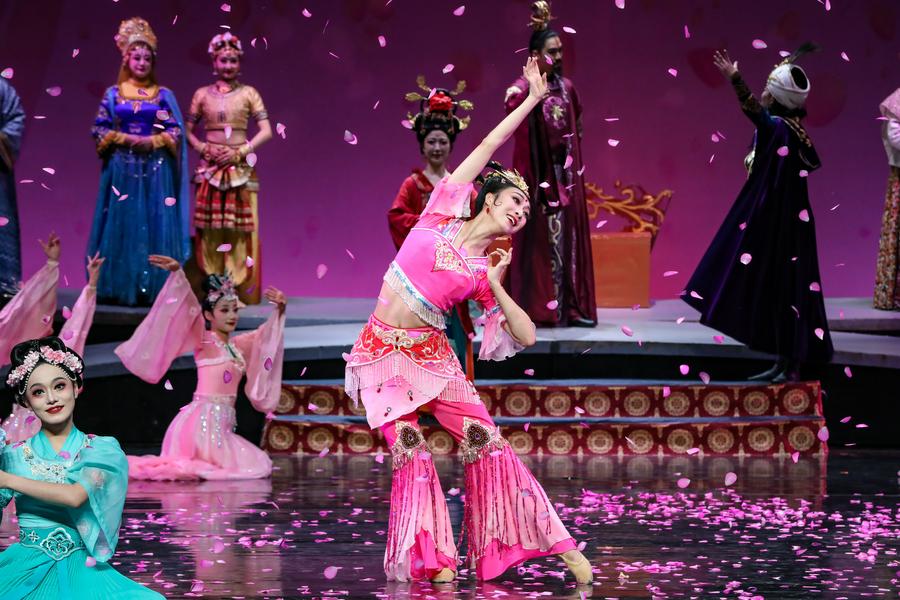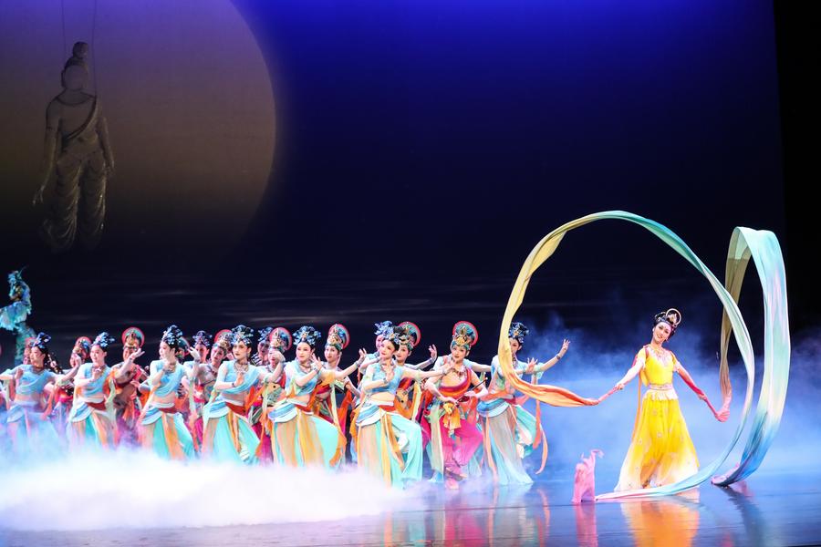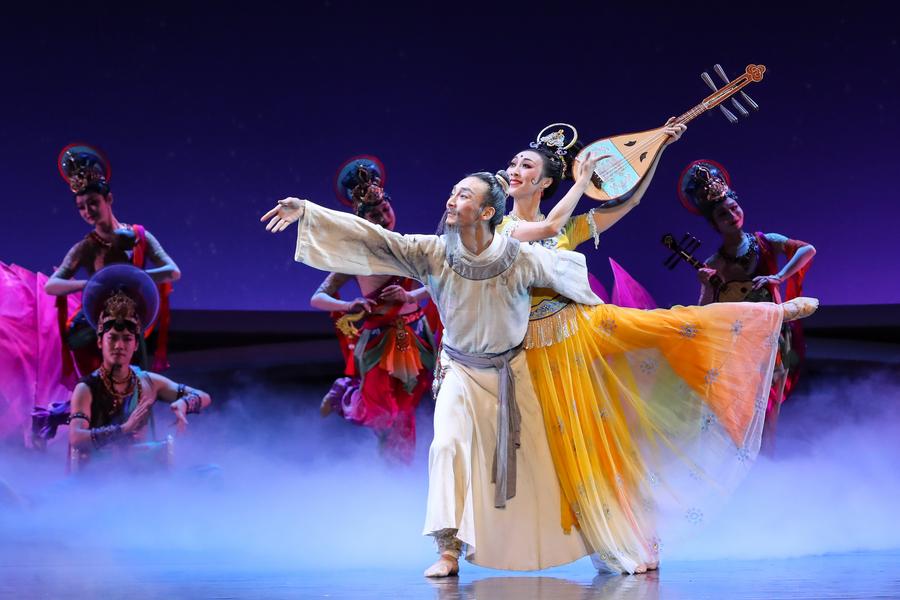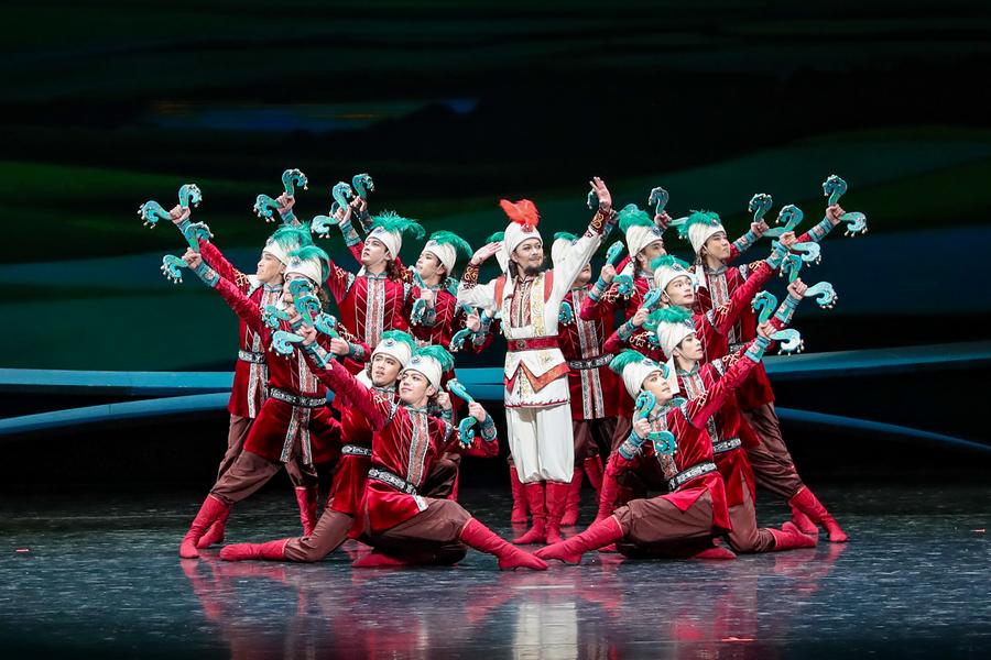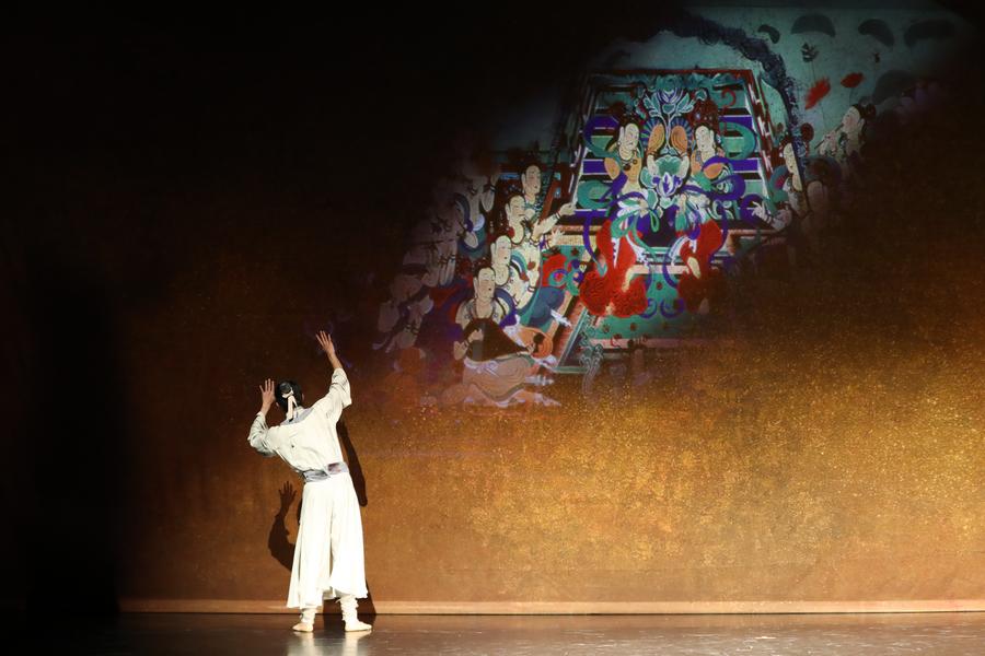 11月28日、甘粛大劇院で舞踊劇「絲路花雨」を披露する出演者。(蘭州=新華社記者/郎兵兵)