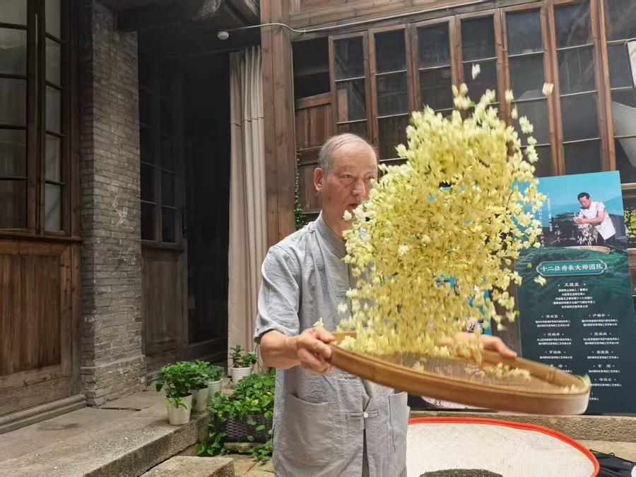 ジャスミン茶を制作する「福州ジャスミン茶香りづけ技法」の国家級代表的伝承者の王徳星(おう・とくせい)さん。(福州=新華社配信)