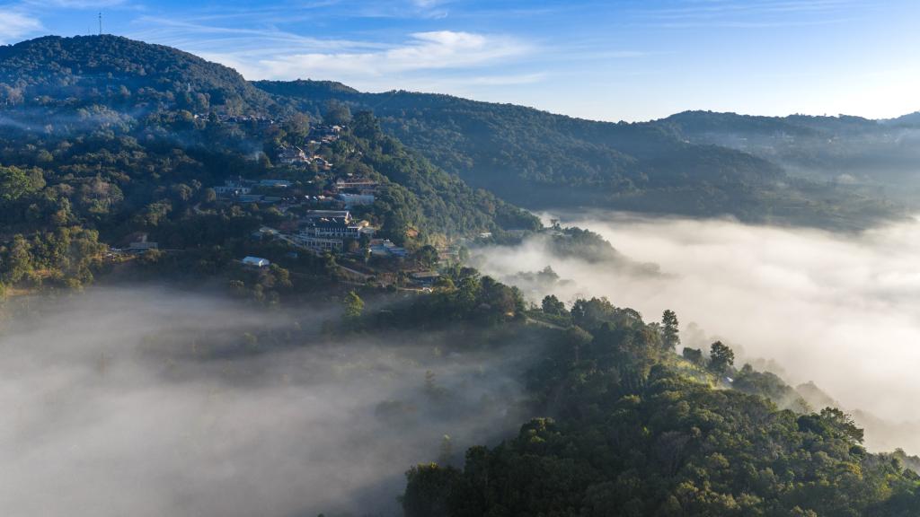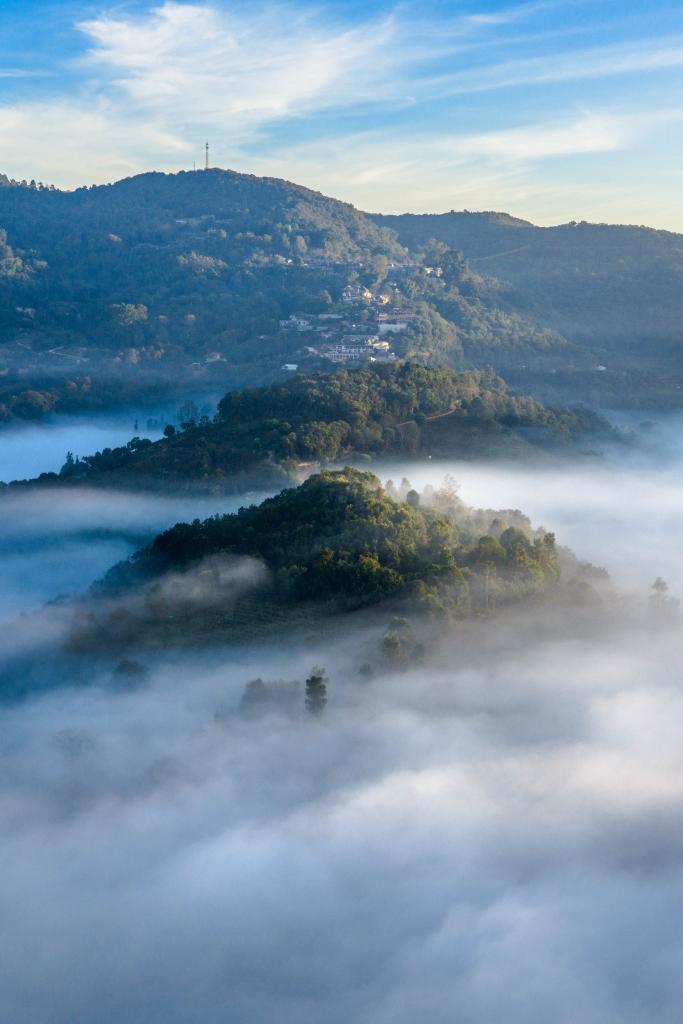 1日、雲や霧に包まれた景邁山。(ドローンから、普洱=新華社記者/胡超)