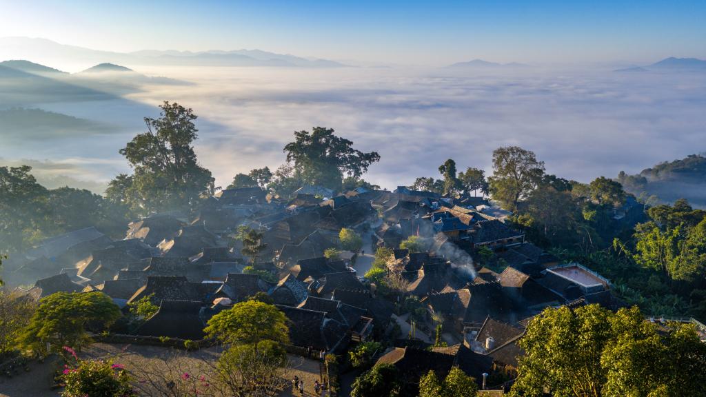 1日、雲や霧に包まれた景邁山の古い村、翁基古寨。(ドローンから、普洱=新華社記者/胡超)