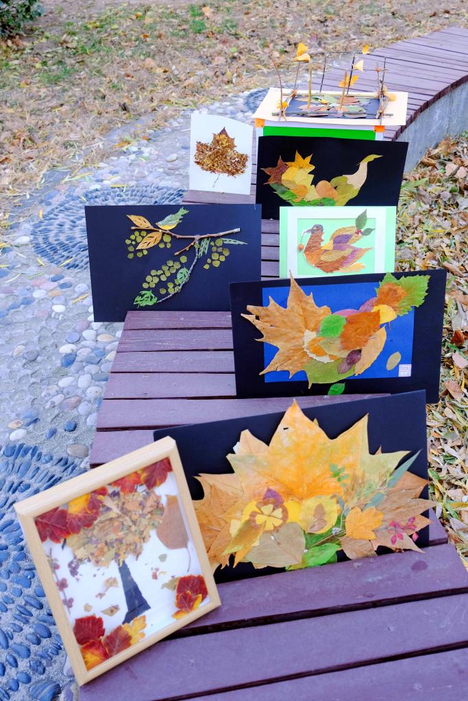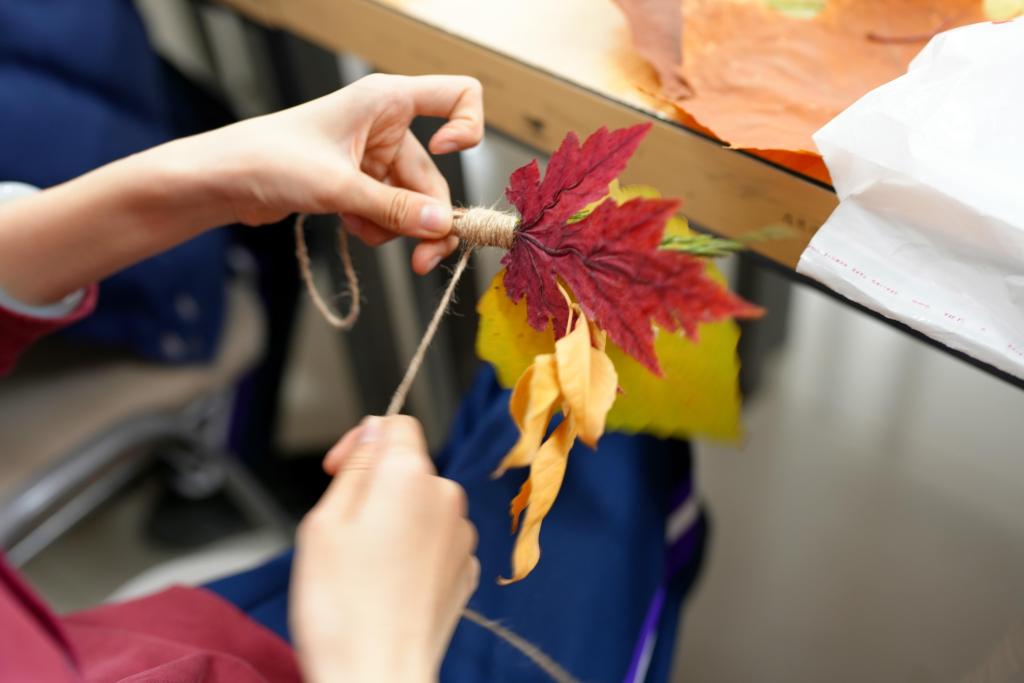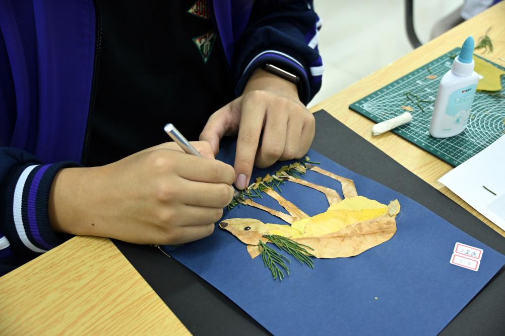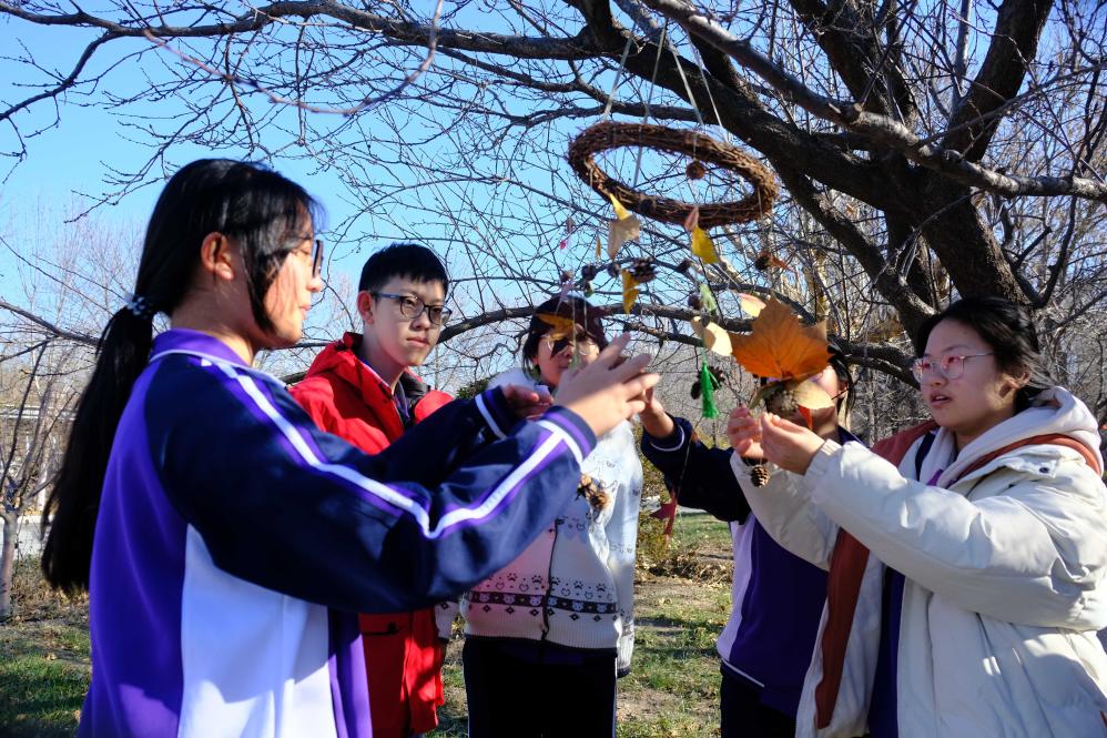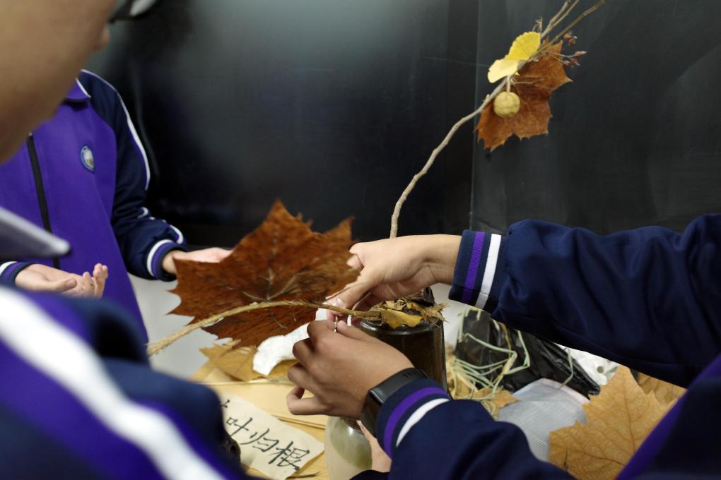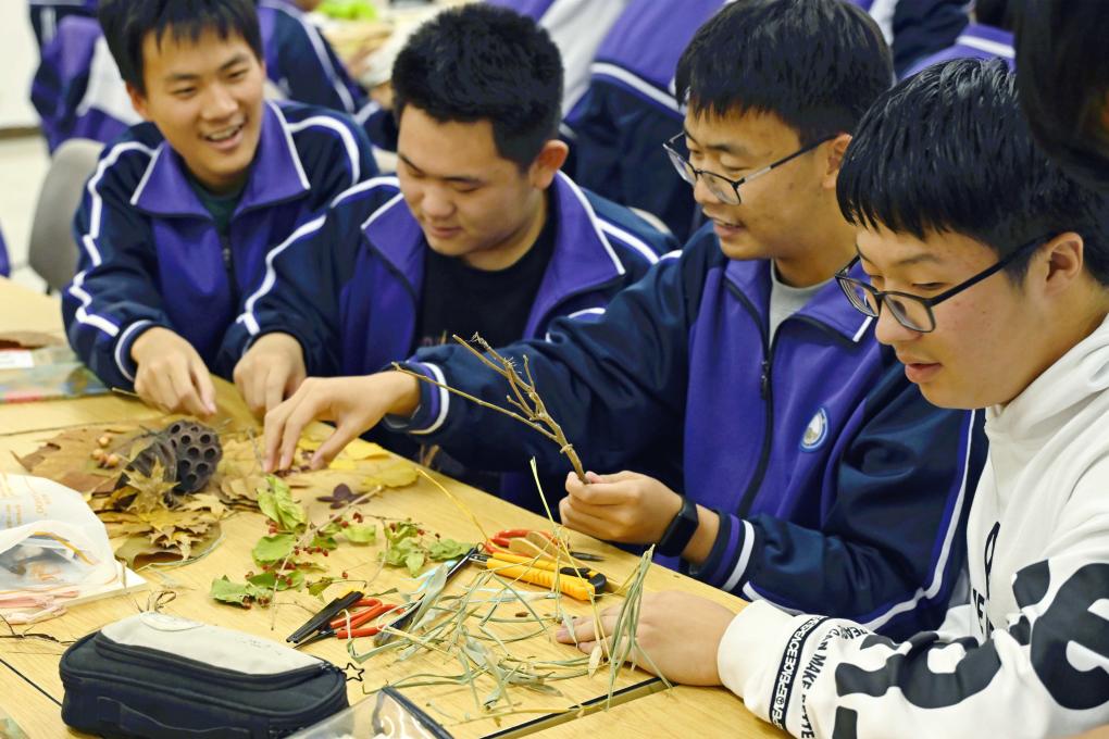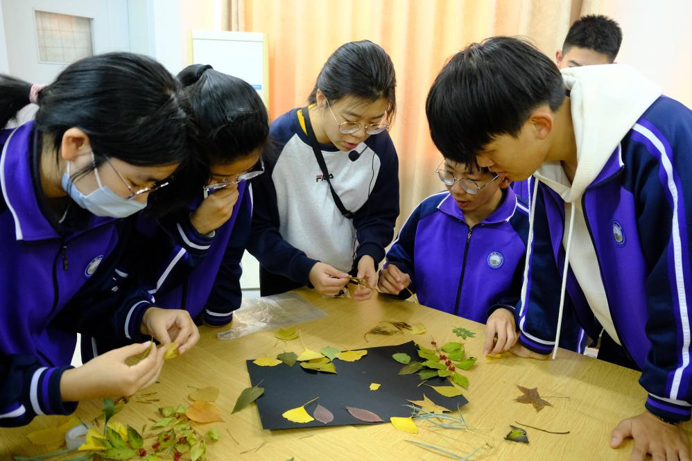 11月25日、落ち葉を使った作品に取り組む生徒ら。(天津=新華社配信/邢岳坤)