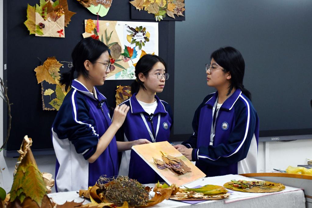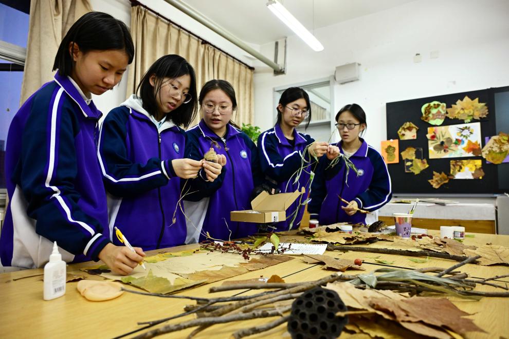 11月25日、落ち葉を使った作品に取り組む生徒ら。(天津=新華社配信/閆皓然)